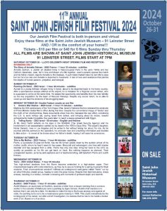 Ticketholders may choose to attend the screenings in person at the Saint John Jewish Historical Museum or online with a unique non-transferable link for each film selected. To assist with processing time for on-line viewing, tickets should be purchased by October 23, 2023. Tickets will also be available at the door for those wishing to attend in person. Screenings will begin promptly at 7:00 p.m. each evening.